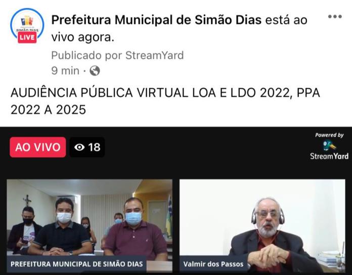 A Prefeitura Municipal de Simão Dias segue planejando ações futuras de benefício à população. Nesta quarta-feira, 31 de março, a gestão municipal, através da Secretaria Municipal de Administração, Planejamento e Orçamento, realizou a Audiência Pública Virtual para elaboração do Plano Plurianual (PPA) de 2022 a 2025, da Lei de Diretrizes Orçamentárias (LDO) e da Lei Orçamentária Anual (LOA) para o exercício financeiro de 2022.